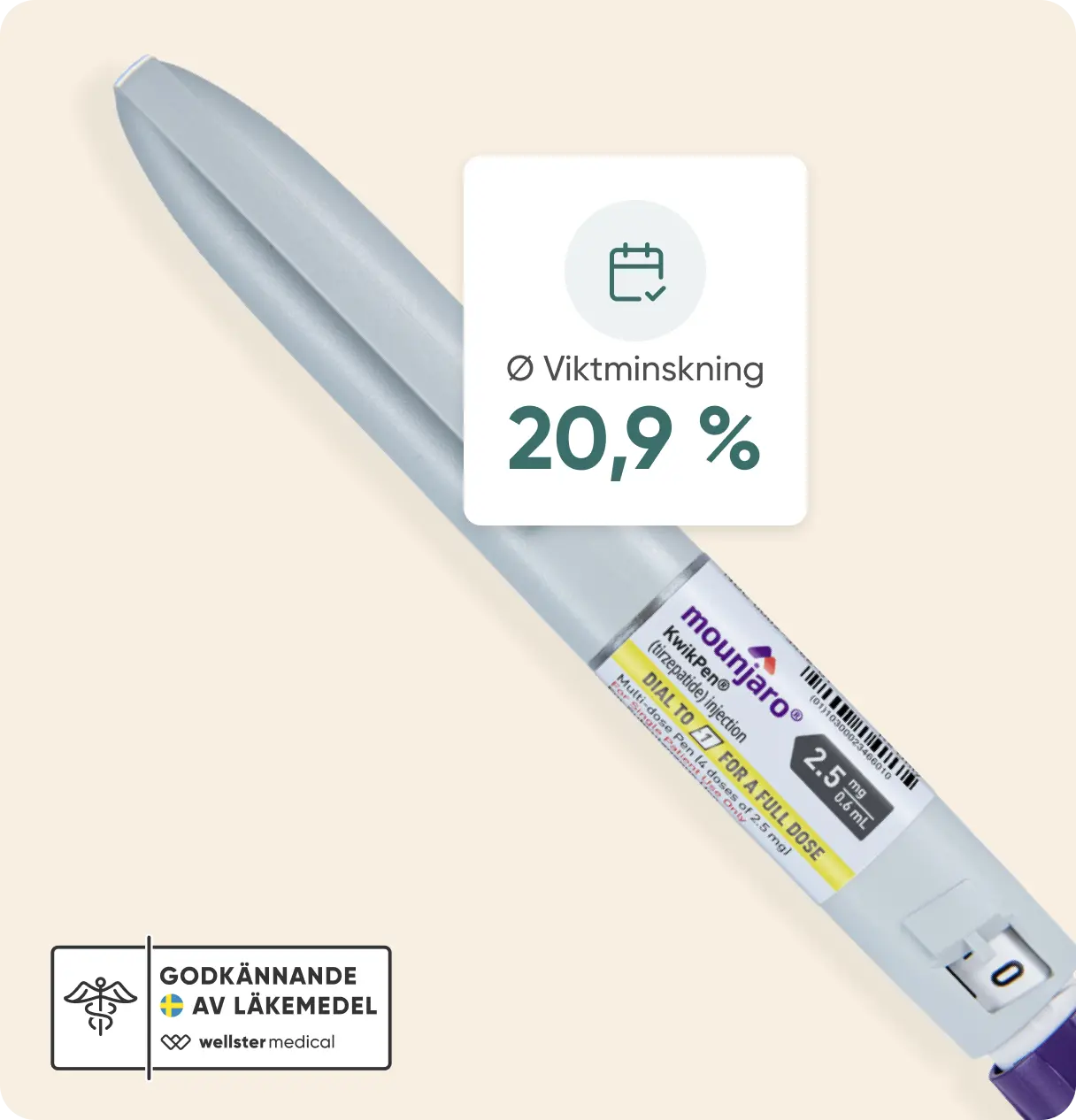Mounjaro® innehåller den aktiva substansen tirzepatid och används för att behandla vuxna med typ 2-diabetes mellitus. Mounjaro® sänker endast blodsockernivåerna när de är höga. Mounjaro® används också för att behandla vuxna med fetma eller övervikt (med ett BMI på minst 27 kg/m²). Mounjaro® påverkar aptitregleringen, vilket kan hjälpa dig att äta mindre och minska din kroppsvikt.